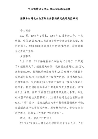 【七哥公文】2025年:某镇乡村建设办公室副主任抗洪救灾先进典型事迹+更多免费公文+VX:QiGeGongWen2024+更多免费公文+VX:QiGeGongWen2024