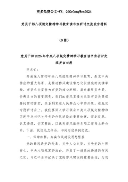 【七哥公文】2025年:(9篇)党员干部八项规定精神学习教育读书班研讨交流发言材料+更多免费公文+VX:QiGeGongWen2024+更多免费公文+VX:QiGeGongWen2024