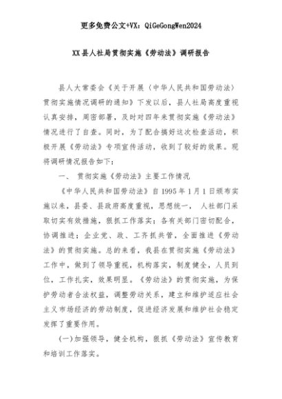 【七哥公文】2025年:XX县人社局贯彻实施《劳动法》调研报告+更多免费公文+VX:QiGeGongWen2024+更多免费公文+VX:QiGeGongWen2024