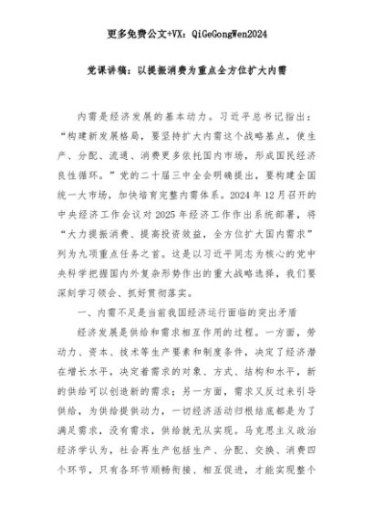 【七哥公文】2025年:党课讲稿:以提振消费为重点全方位扩大内需+更多免费公文+VX:QiGeGongWen2024+更多免费公文+VX:QiGeGongWen2024