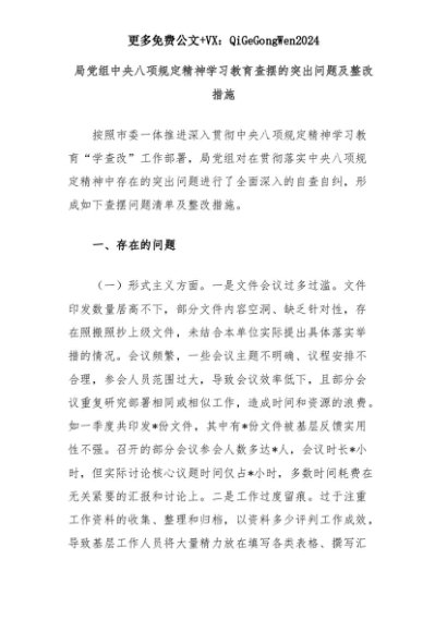【七哥公文】2025年:局党组中央八项规定精神学习教育查摆的突出问题及整改措施+更多免费公文+VX:QiGeGongWen2024+更多免费公文+VX:QiGeGongWen2024