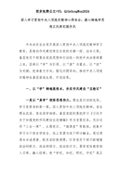 【七哥公文】2025年:深入学习贯彻中央八项规定精神心得体会:凝心铸魂学思想正风肃纪强作风+更多免费公文+VX:QiGeGongWen2024+更多免费公文+VX:QiGeGongWen2024