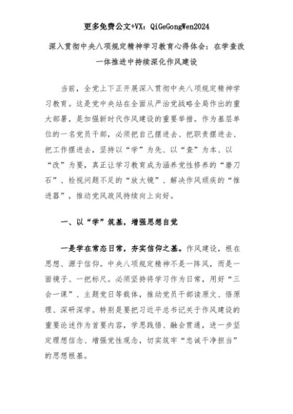 【七哥公文】2025年:深入贯彻中央八项规定精神学习教育心得体会:在学查改一体推进中持续深化作风建设+更多免费公文+VX:QiGeGongWen2024+更多免费公文+VX:QiGeGongWen2024