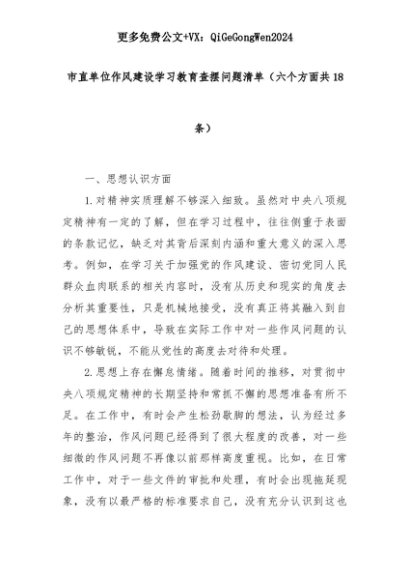 【七哥公文】2025年:市直单位作风建设学习教育查摆问题清单(六个方面共18条)+更多免费公文+VX:QiGeGongWen2024+更多免费公文+VX:QiGeGongWen2024