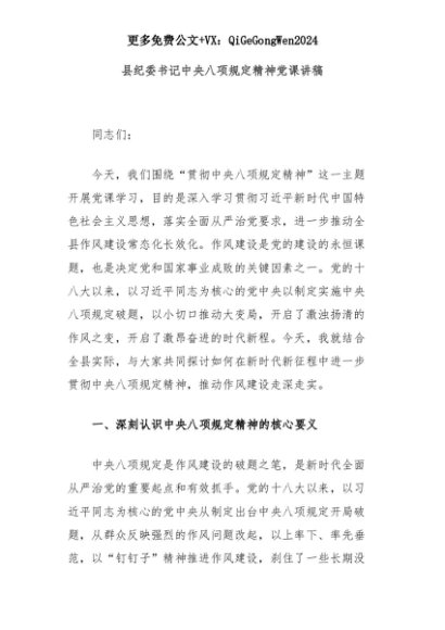 【七哥公文】2025年:县纪委书记中央八项规定精神党课讲稿+更多免费公文+VX:QiGeGongWen2024+更多免费公文+VX:QiGeGongWen2024