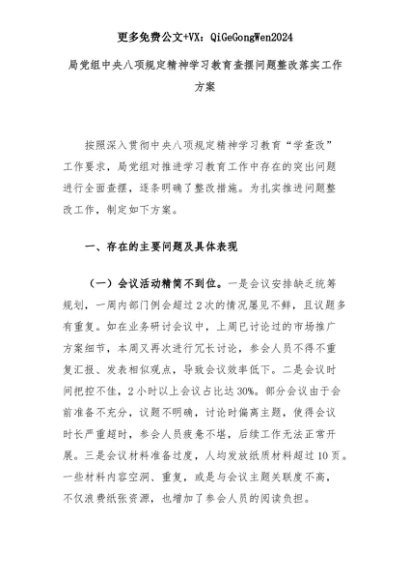 【七哥公文】2025年:局党组中央八项规定精神学习教育查摆问题整改落实工作方案+更多免费公文+VX:QiGeGongWen2024+更多免费公文+VX:QiGeGongWen2024