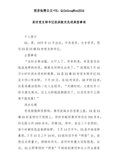 【七哥公文】2025年:某村党支部书记抗洪救灾先进典型事迹+更多免费公文+VX:QiGeGongWen2024+更多免费公文+VX:QiGeGongWen2024