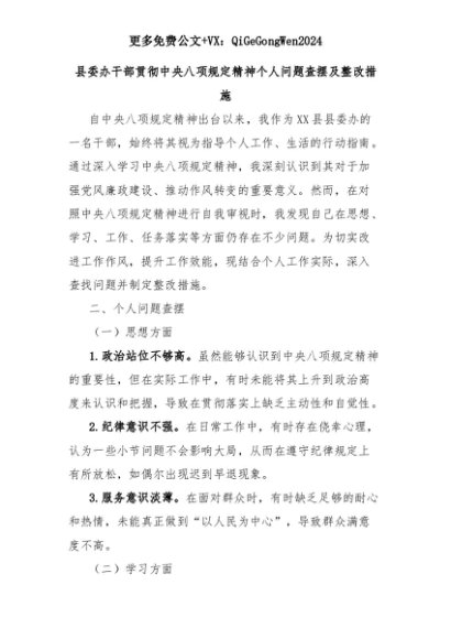 【七哥公文】2025年:县委办干部贯彻中央八项规定精神个人问题查摆及整改措施+更多免费公文+VX:QiGeGongWen2024+更多免费公文+VX:QiGeGongWen2024