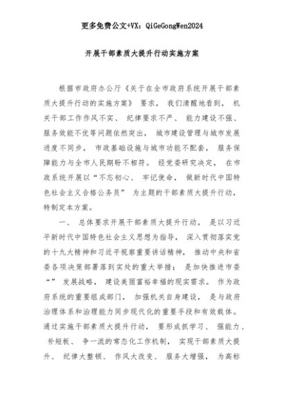 【七哥公文】2025年:开展干部素质大提升行动实施方案+更多免费公文+VX:QiGeGongWen2024+更多免费公文+VX:QiGeGongWen2024