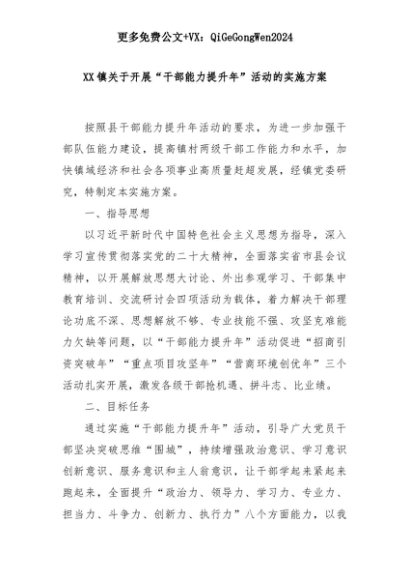 【七哥公文】2025年:XX镇关于开展“干部能力提升年”活动的实施方案+更多免费公文+VX:QiGeGongWen2024+更多免费公文+VX:QiGeGongWen2024