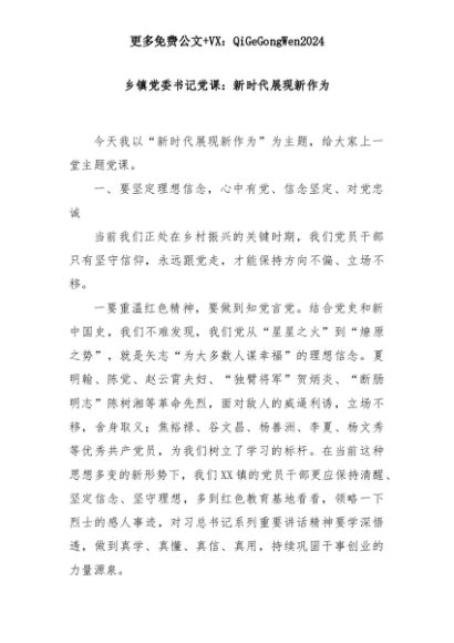 【七哥公文】2025年:乡镇党委书记党课:新时代展现新作为+更多免费公文+VX:QiGeGongWen2024+更多免费公文+VX:QiGeGongWen2024