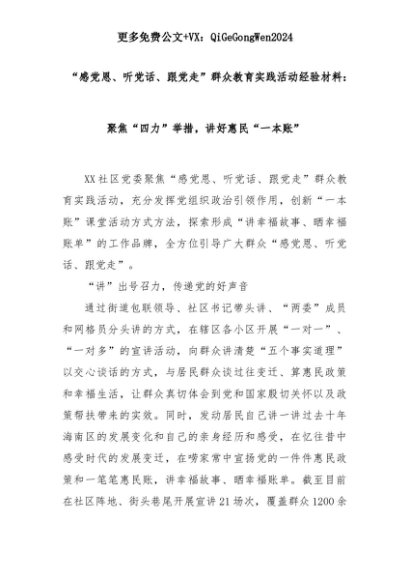 【七哥公文】2025年:“感党恩、听党话、跟党走”群众教育实践活动经验材料:聚焦“四力”举措,讲好惠民“一本账”+更多免费公文+VX:QiGeGongWen2024+更多免费公文+VX:QiGeGongWen2024