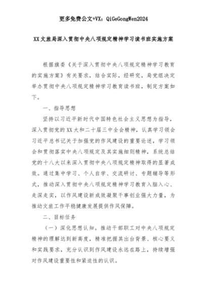 【七哥公文】2025年:XX文旅局深入贯彻中央八项规定精神学习读书班实施方案+更多免费公文+VX:QiGeGongWen2024+更多免费公文+VX:QiGeGongWen2024