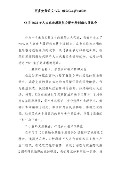 【七哥公文】2025年:XX县2025年人大代表履职能力提升培训班心得体会+更多免费公文+VX:QiGeGongWen2024+更多免费公文+VX:QiGeGongWen2024