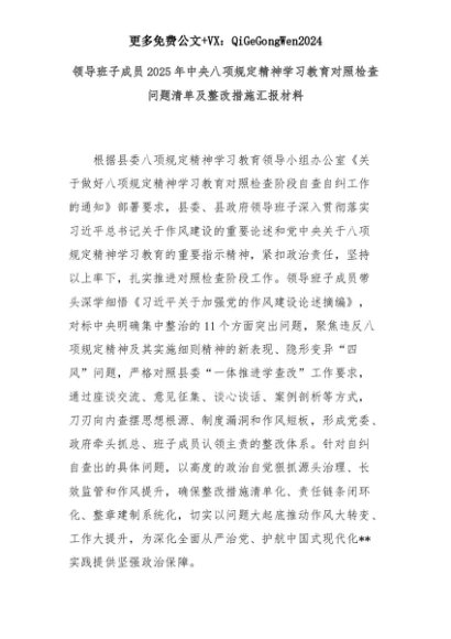 【七哥公文】2025年:领导班子成员2025年中央八项规定精神学习教育对照检查问题清单及整改措施汇报材料+更多免费公文+VX:QiGeGongWen2024+更多免费公文+VX:QiGeGongWen2024