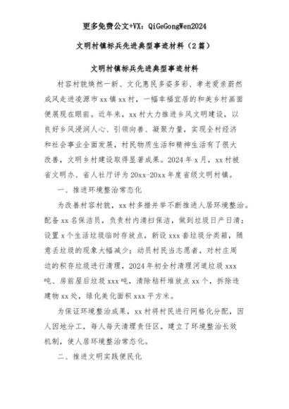 【七哥公文】2025年:(2篇)文明村镇标兵先进典型事迹材料+更多免费公文+VX:QiGeGongWen2024+更多免费公文+VX:QiGeGongWen2024