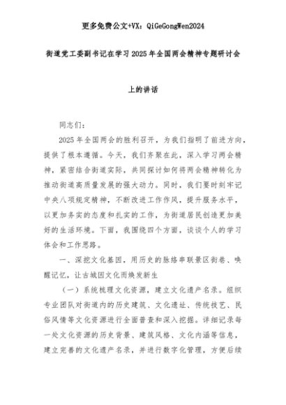 【七哥公文】2025年:街道党工委副书记在学习2025年全国两会精神专题研讨会上的讲话+更多免费公文+VX:QiGeGongWen2024+更多免费公文+VX:QiGeGongWen2024