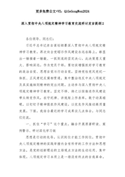【七哥公文】2025年:深入贯彻中央八项规定精神学习教育交流研讨发言提纲2+更多免费公文+VX:QiGeGongWen2024+更多免费公文+VX:QiGeGongWen2024