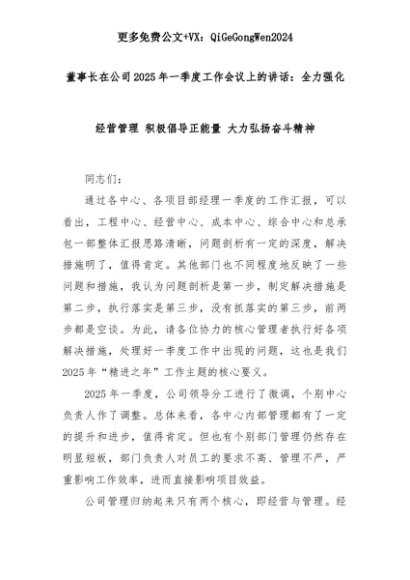 【七哥公文】2025年:董事长在公司2025年一季度工作会议上的讲话:全力强化经营管理 积极倡导正能量 大力弘扬奋斗精神+更多免费公文+VX:QiGeGongWen2024+更多免费公文+VX:QiGeGongWen2024