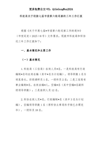 【七哥公文】2025年:科技局关于迎接七届市委第六轮巡察的三年工作汇报+更多免费公文+VX:QiGeGongWen2024+更多免费公文+VX:QiGeGongWen2024
