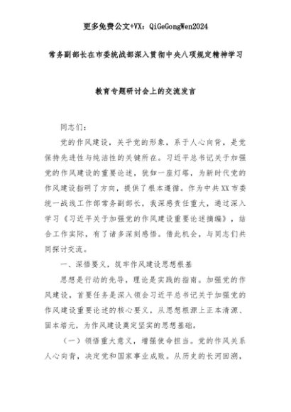 【七哥公文】2025年:常务副部长在市委统战部深入贯彻中央八项规定精神学习教育专题研讨会上的交流发言+更多免费公文+VX:QiGeGongWen2024+更多免费公文+VX:QiGeGongWen2024