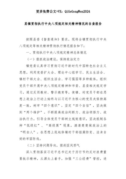 【七哥公文】2025年:某镇贯彻执行中央八项规定相关精神情况的自查报告+更多免费公文+VX:QiGeGongWen2024+更多免费公文+VX:QiGeGongWen2024