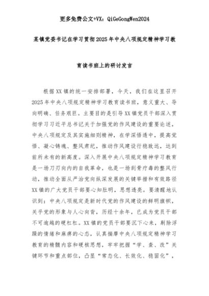 【七哥公文】2025年:某镇党委书记在学习贯彻2025年中央八项规定精神学习教育读书班上的研讨发言+更多免费公文+VX:QiGeGongWen2024+更多免费公文+VX:QiGeGongWen2024