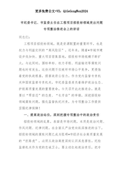 【七哥公文】2025年:市纪委书记、市监委主任在工程项目招投标领域突出问题专项整治推进会上的讲话+更多免费公文+VX:QiGeGongWen2024+更多免费公文+VX:QiGeGongWen2024