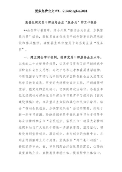 【七哥公文】2025年:某县组织党员干部当好企业“服务员”的工作报告+更多免费公文+VX:QiGeGongWen2024+更多免费公文+VX:QiGeGongWen2024