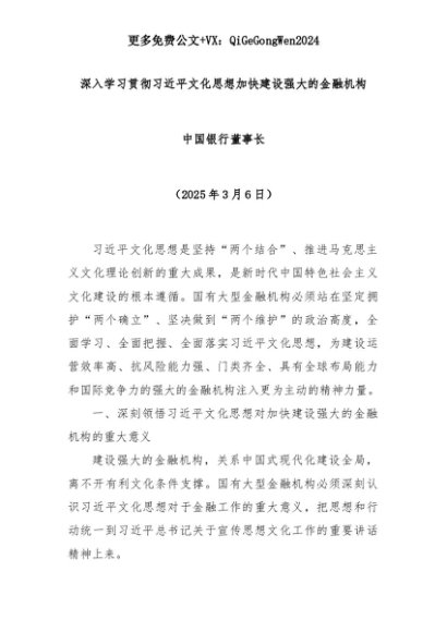 【七哥公文】2025年:深入学习贯彻习近平文化思想加快建设强大的金融机构+更多免费公文+VX:QiGeGongWen2024+更多免费公文+VX:QiGeGongWen2024
