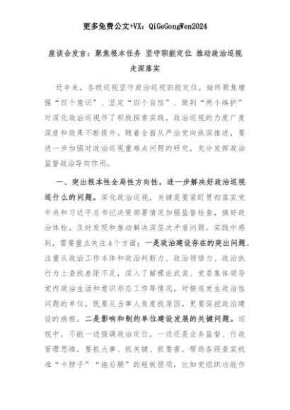 【七哥公文】2025年:座谈会发言:聚焦根本任务 坚守职能定位 推动政治巡视走深落实+更多免费公文+VX:QiGeGongWen2024+更多免费公文+VX:QiGeGongWen2024