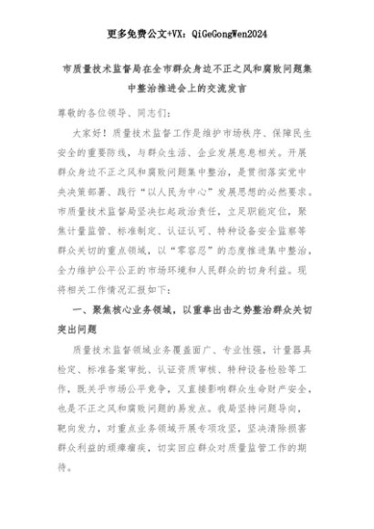 【七哥公文】2025年:市质量技术监督局在全市群众身边不正之风和腐败问题集中整治推进会上的交流发言+更多免费公文+VX:QiGeGongWen2024+更多免费公文+VX:QiGeGongWen2024
