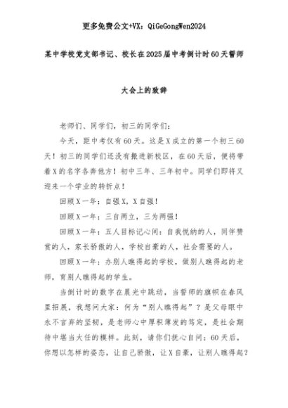 【七哥公文】2025年:某中学校党支部书记、校长在2025届中考倒计时60天誓师大会上的致辞+更多免费公文+VX:QiGeGongWen2024+更多免费公文+VX:QiGeGongWen2024