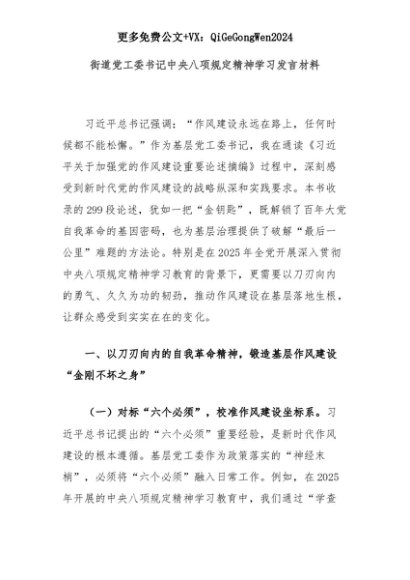 【七哥公文】2025年:街道党工委书记中央八项规定精神学习发言材料+更多免费公文+VX:QiGeGongWen2024+更多免费公文+VX:QiGeGongWen2024