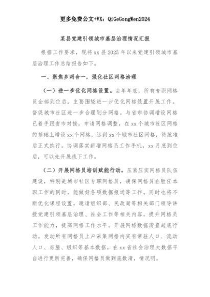 【七哥公文】2025年:某县党建引领城市基层治理情况汇报+更多免费公文+VX:QiGeGongWen2024+更多免费公文+VX:QiGeGongWen2024