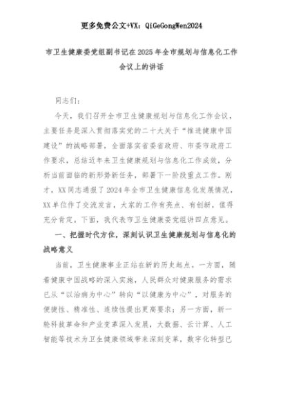 【七哥公文】2025年:市卫生健康委党组副书记在2025年全市规划与信息化工作会议上的讲话+更多免费公文+VX:QiGeGongWen2024+更多免费公文+VX:QiGeGongWen2024