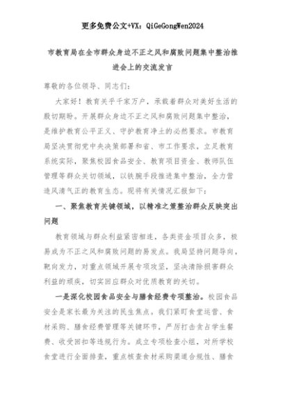 【七哥公文】2025年:市教育局在全市群众身边不正之风和腐败问题集中整治推进会上的交流发言+更多免费公文+VX:QiGeGongWen2024+更多免费公文+VX:QiGeGongWen2024