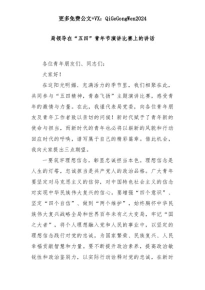 【七哥公文】2025年:局领导在“五四”青年节演讲比赛上的讲话+更多免费公文+VX:QiGeGongWen2024+更多免费公文+VX:QiGeGongWen2024