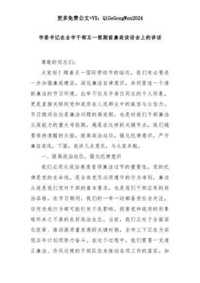 【七哥公文】2025年:市委书记在全市干部五一假期前廉政谈话会上的讲话+更多免费公文+VX:QiGeGongWen2024+更多免费公文+VX:QiGeGongWen2024