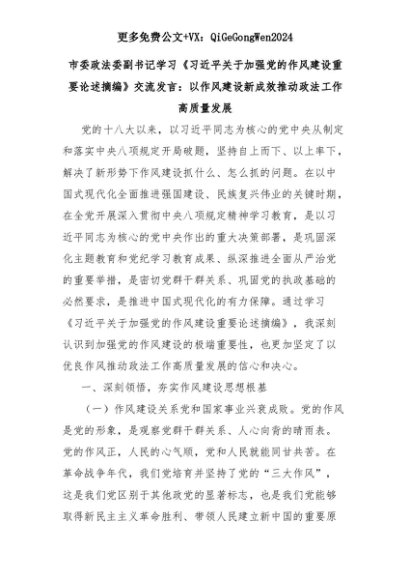 【七哥公文】2025年:市委政法委副书记学习《习近平关于加强党的作风建设重要论述摘编》交流发言:以作风建设新成效推动政法工作高质量发展+更多免费公文+VX:QiGeGongWen2024+更多免费公文+VX:QiGeGongWen2024