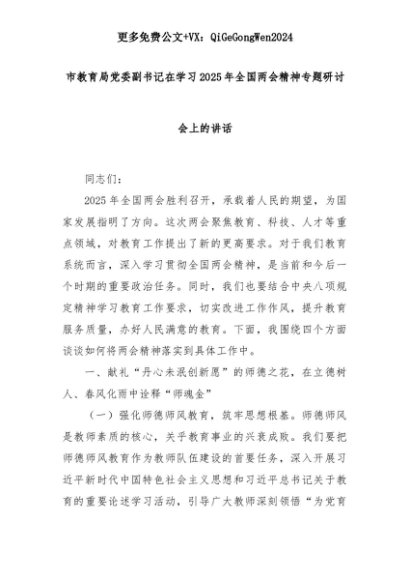 【七哥公文】2025年:市教育局党委副书记在学习2025年全国两会精神专题研讨会上的讲话+更多免费公文+VX:QiGeGongWen2024+更多免费公文+VX:QiGeGongWen2024