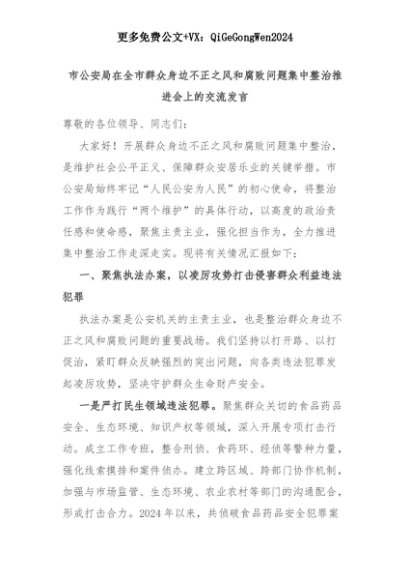 【七哥公文】2025年:市公安局在全市群众身边不正之风和腐败问题集中整治推进会上的交流发言+更多免费公文+VX:QiGeGongWen2024+更多免费公文+VX:QiGeGongWen2024