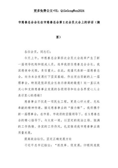 【七哥公文】2025年:市慈善总会会长在市慈善总会第X次会员大会上的讲话(摘要)+更多免费公文+VX:QiGeGongWen2024+更多免费公文+VX:QiGeGongWen2024