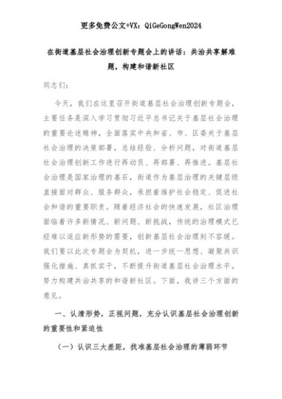 【七哥公文】2025年:在街道基层社会治理创新专题会上的讲话:共治共享解难题,构建和谐新社区+更多免费公文+VX:QiGeGongWen2024+更多免费公文+VX:QiGeGongWen2024