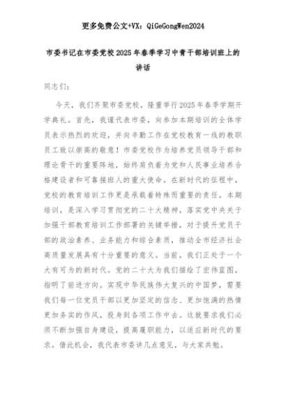【七哥公文】2025年:市委书记在市委党校2025年春季学习中青干部培训班上的讲话+更多免费公文+VX:QiGeGongWen2024+更多免费公文+VX:QiGeGongWen2024