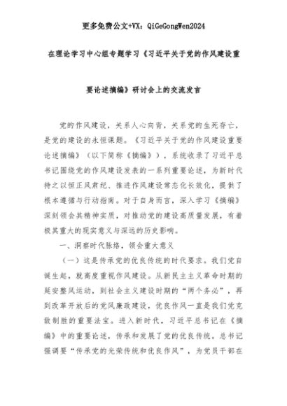 【七哥公文】2025年:在理论学习中心组专题学习《习近平关于党的作风建设重要论述摘编》研讨会上的交流发言+更多免费公文+VX:QiGeGongWen2024+更多免费公文+VX:QiGeGongWen2024