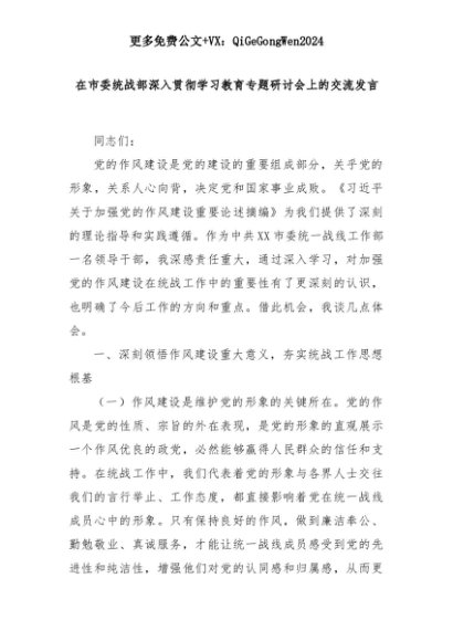 【七哥公文】2025年:在市委统战部深入贯彻学习教育专题研讨会上的交流发言+更多免费公文+VX:QiGeGongWen2024+更多免费公文+VX:QiGeGongWen2024