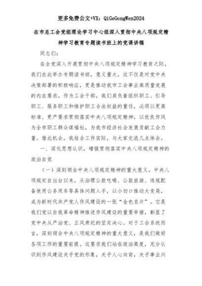【七哥公文】2025年:在市总工会党组理论学习中心组深入贯彻中央八项规定精神学习教育专题读书班上的党课讲稿+更多免费公文+VX:QiGeGongWen2024+更多免费公文+VX:QiGeGongWen2024