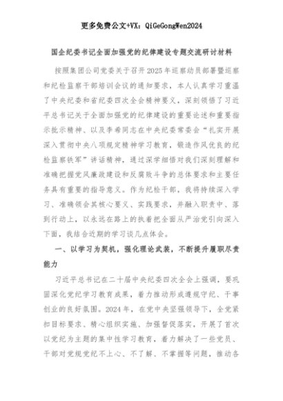 【七哥公文】2025年:国企纪委书记全面加强党的纪律建设专题交流研讨材料+更多免费公文+VX:QiGeGongWen2024+更多免费公文+VX:QiGeGongWen2024