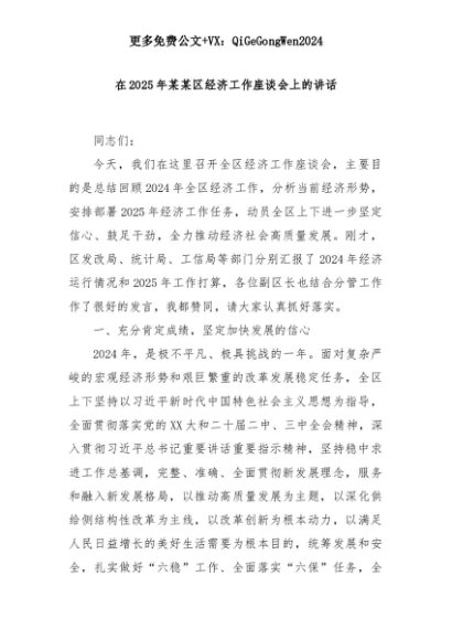 【七哥公文】2025年:在2025年某某区经济工作座谈会上的讲话+更多免费公文+VX:QiGeGongWen2024+更多免费公文+VX:QiGeGongWen2024